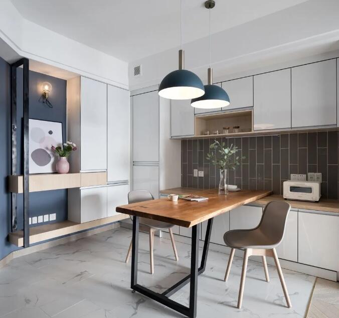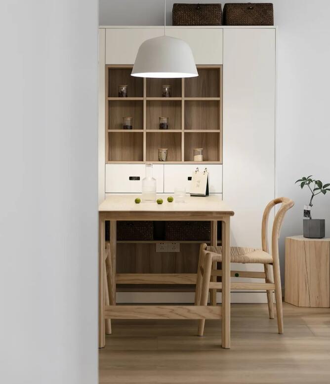 餐桌旁边的餐柜也可以作为水吧使用。烧水壶、榨汁机和咖啡机可以转移到这里,减轻厨房台面的负担!一般增加2个插座,高度比台面高30cm即可。